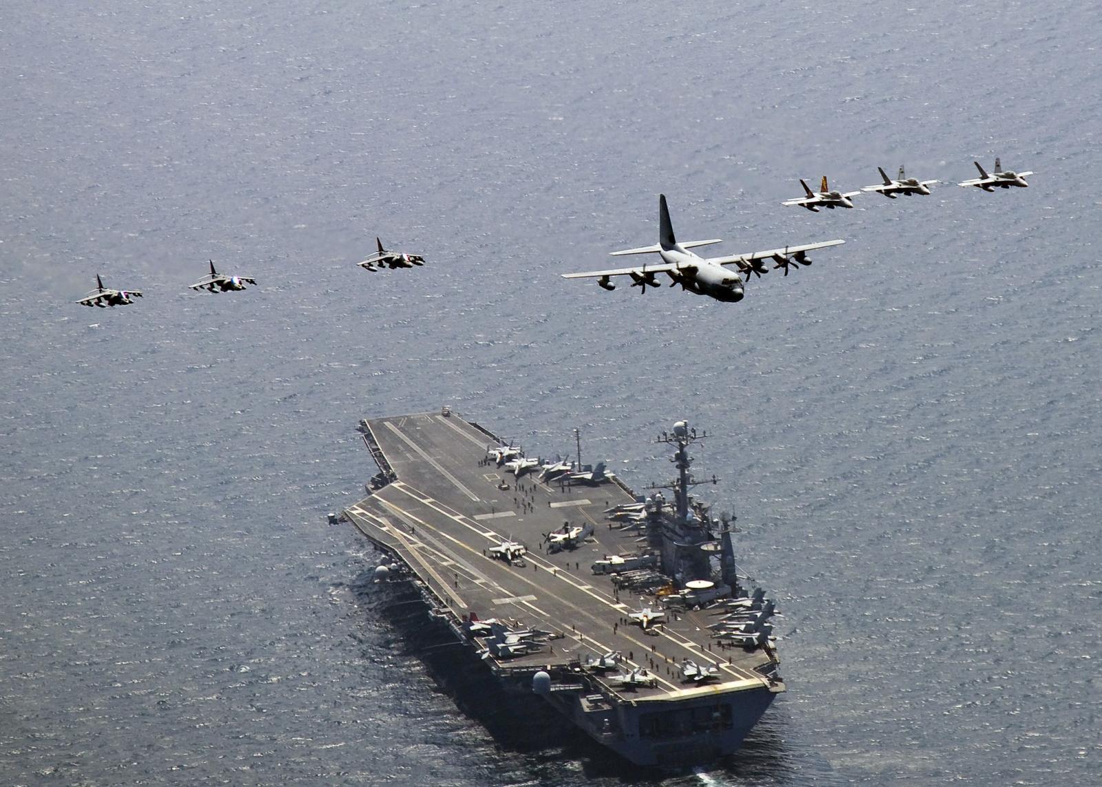 A U.S. Marine Corps C-130 Hercules aircraft, center, leads a formation of three F/A-18C Hornet aircraft, right, and three A/V-8B Harrier aircraft as they fly over USS George Washington (CVN 73) July 27, 2010, while the carrier is under way in the East Sea. George Washington is participating in the combined U.S. and South Korean alliance maritime and air readiness exercise Invincible Spirit. (DoD photo by Mass Communication Specialist 3rd Class Charles Oki, U.S. Navy/Released)