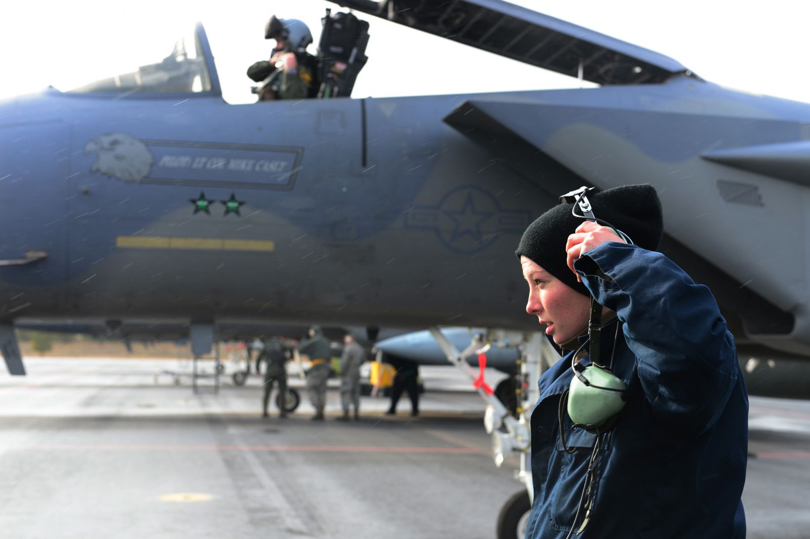 ALBACETE AIR BASE, Spain -- Airman 1st Class Ivy Collins, 748th Aircraft Maintenance Squadron crew chief, prepares to communicate with Lt. Col. Mike Casey, 493rd Fighter Squadron commander, prior to the launch of six F-15C Eagles from the 493rd Fighter Squadron during the Tactical Leadership Program Jan. 16, 2013. The 493rd FS is participating in the multi-national program, which develops key leadership and mission planning skills needed for NATO operations. (U.S. Air Force photo by Senior Airman Lausanne Morgan)