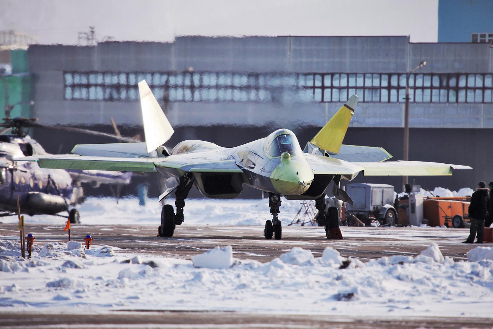 Foto del prototipo del T-50, caccia di 5a generazione russo, durante i test.