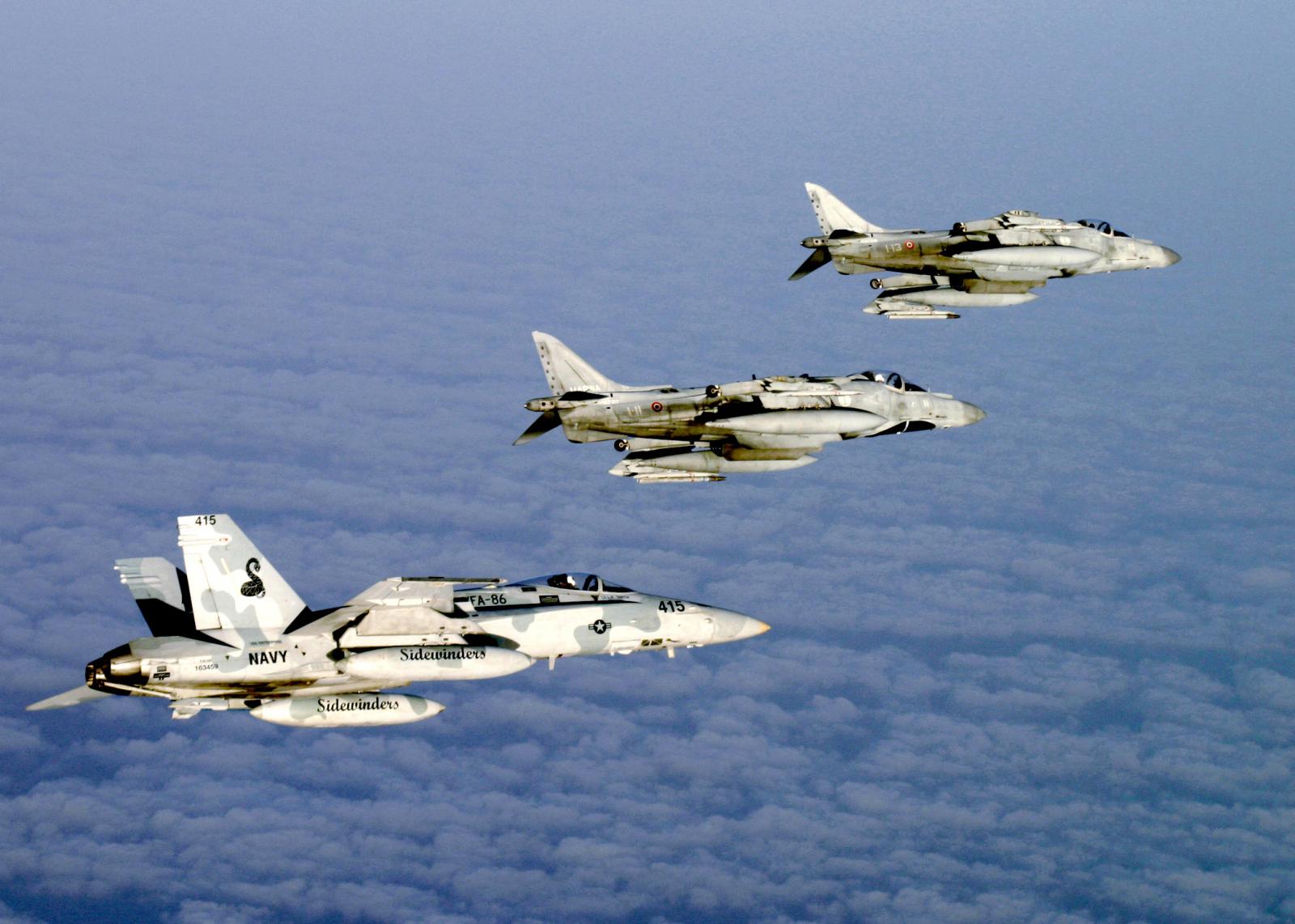 Un Super Hornet del VFA-86 "Sidewinders" in formazione assieme agli AV-8B Harrier II Plus dei "Lupi Grigi" della Marina Militare Italiana