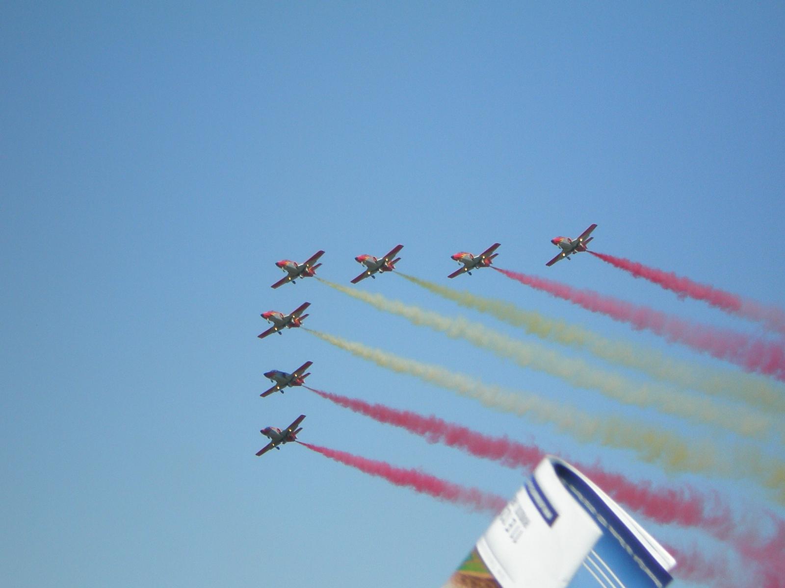 il "bicolore" spagnolo sfila davanti ai presenti con i fumi rossi e gialli dei casa 101 con i carrelli estratti della pattuglia aguila.