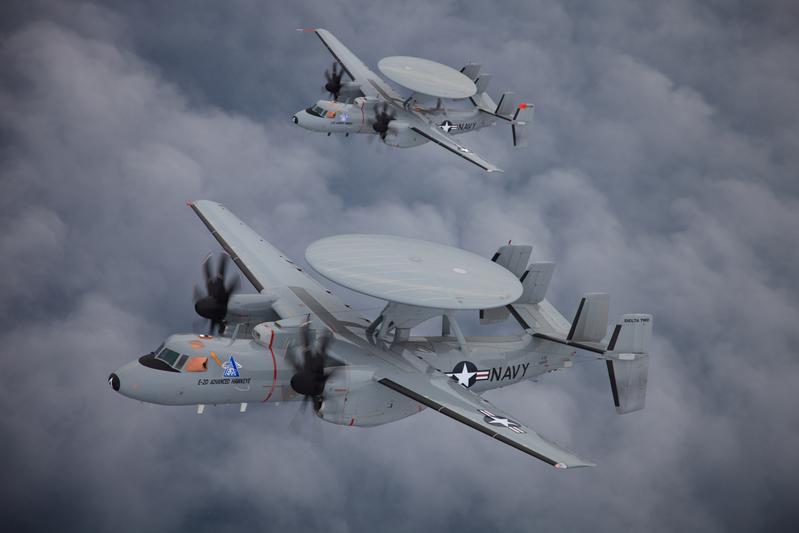 I primi due esemplari della versione D dell'Hawkeye durante i test in volo