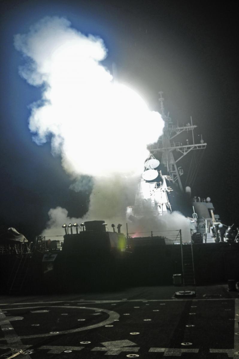 MEDITERRANEAN SEA (March. 19, 2011) The Arleigh Burke-class guided-missile destroyer USS Barry (DDG 52) launches a Tomahawk missile in support of Operation Odyssey Dawn. This was one of approximately 110 cruise missiles fired from U.S. and British ships and submarines that targeted about 20 radar and anti-aircraft sites along Libya's Mediterranean coast. Joint Task Force Odyssey Dawn is the U.S. Africa Command task force established to provide operational and tactical command and control of U.S. military forces supporting the international response to the unrest in Libya and enforcement of United Nations Security Council Resolution (UNSCR) 1973. (U.S. Navy photo by Mass Communication Specialist 3rd Class Jonathan Sunderman/Released)