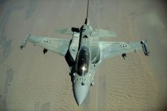 Un F-18 elvetico rilascia flare tra le valli alpine.
