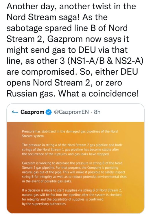Qualche punto in ordine sparso: - Uso nucleare: No perché semplicemente se lo fai ti molla anche il tuo cane, inoltre non ci sono target che valgano anche una sola tattica. La tiri contro cosa? un deposito di munizioni che puoi far fuori con un (centinaio di) Kalibr (Qualcuno andrà a segno prima o poi)?. E' semplicemente irreale, stando alla situazione sul campo. -Sabotaggio nord stream: nell'individuare il sabotatore il gioco dei paggetti di corte dello zar è quello di tirare in mezzo biden che ovviamente per quelli che hanno conseguito da tempo il pollice opponibile si riferiva a pressione diplomatica, mentre per i filorussi (che di pollice opponibile nemmeno a parlarne) ha dichiarato il sabotaggio. Da che so io, ne sabotaggi e ne uso di armi nucleari sono qualcosa che viene preventivamente annunciata e sbandierata. Giusto perché gli USA non sono in guerra con la Russia e un atto del genere poteva essere un casus belli. Per non parlare poi del fatto che sono stati mandati assets ASW NATO. Ora, se siamo stati noi non andiamo sempre noi a cercare noi stessi, a meno che dietro non ci sia Marko Ramius. Piuttosto, la mancata fornitura di Gazprom, dettata da scelte politiche, costituisce una chiara violazione agli obblighi contrattuali. Violazione=Penali milionarie. Tante Penali milionarie diventano penali miliardarie. Metti invece che un misterioso attentatore lo fa saltare? Eeeeeeh ... "io no paga, no mia colpa". -foto del giorno: il col. Stirpe spiega che la superiorità aerea russa non è mai esistita perché i russi non erano liberi di svolazzare qua e la, quindi lo spazio aereo era conteso e non perché l'aeronautica ucraina lo contendeva, ma perché lo hanno conteso i SAM. L'espressione di chi capisce che fare 400 missioni in 18mq non è superiorità aerea se nel frattempo gli ucraini ne fanno 10 ma su tutto il resto dell'ucraina.