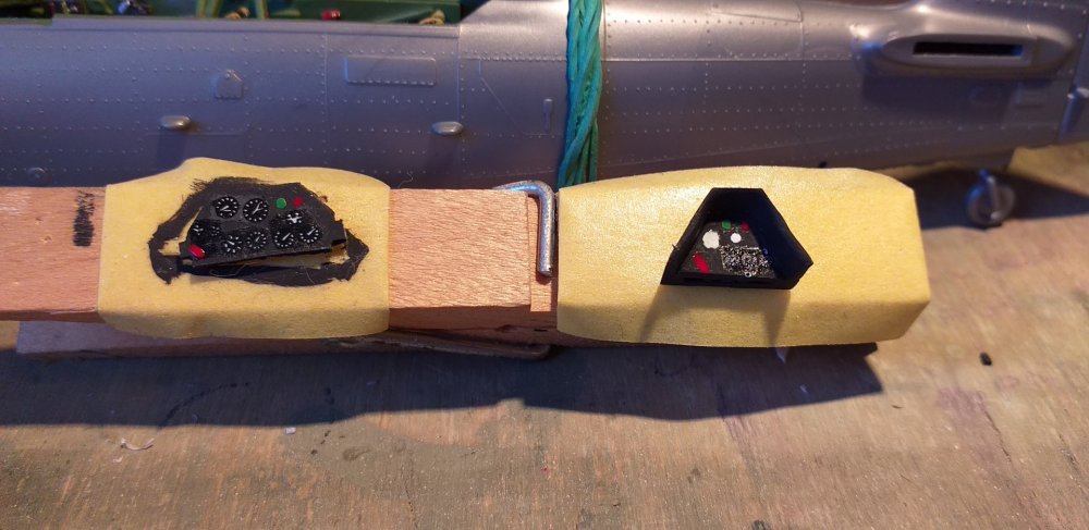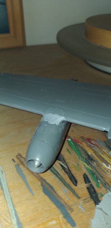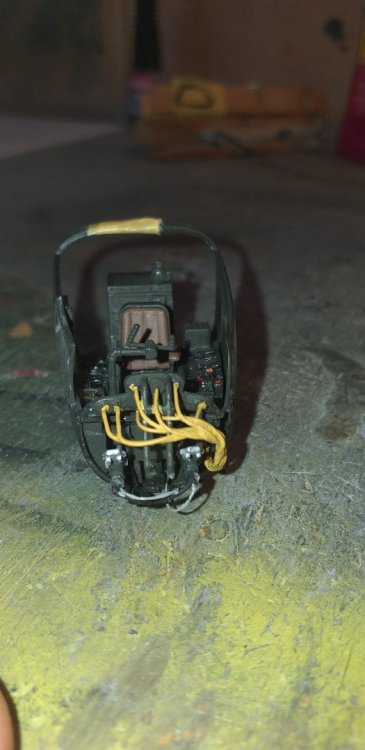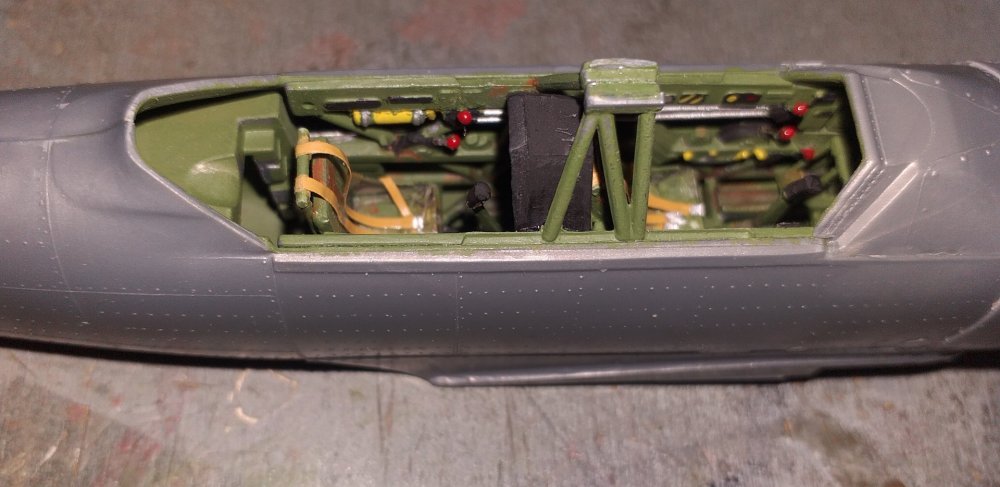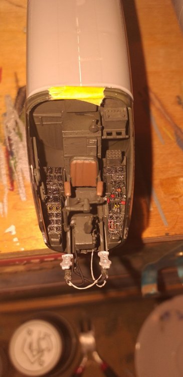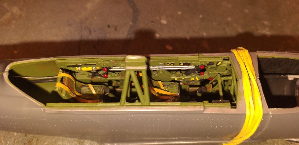 Ci siamo. Ora viene il bello...tutti i cavi del cruscotto da fare. Intanto ho aggiunto i cavi e le tubazioni della pedaliera. Il resto è a buon punto. La giunzione tra motori e bordo d'attacco alare ha richiesto un po' di stucco per "addolcire" l'antiestetico scalino. Le canne delle MG 151/20 sostituite con aghi di siringa del diametro appropriato. Ciao a tutti e alla prossima puntata. PS. Le cinture le aggiungo...non preoccupatevi?