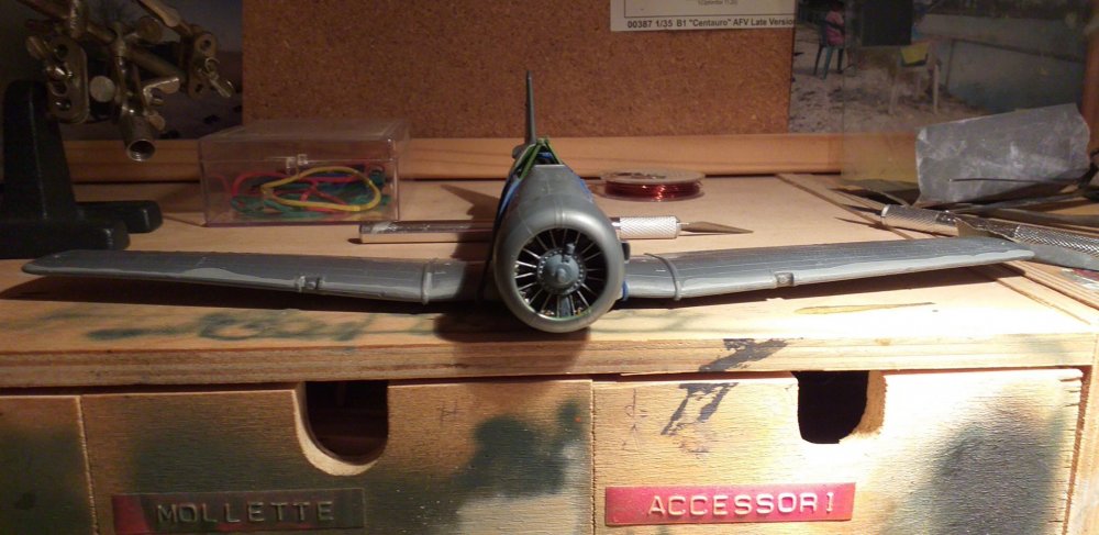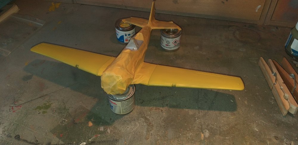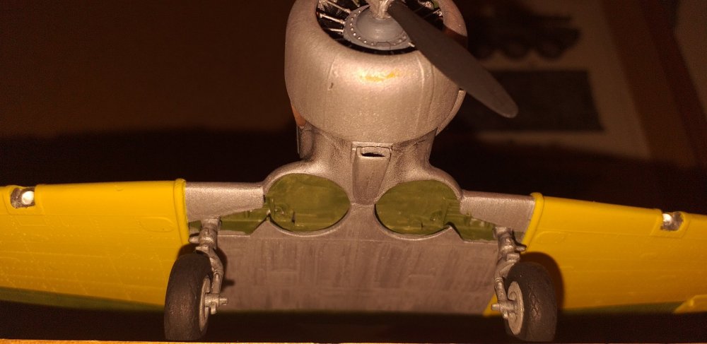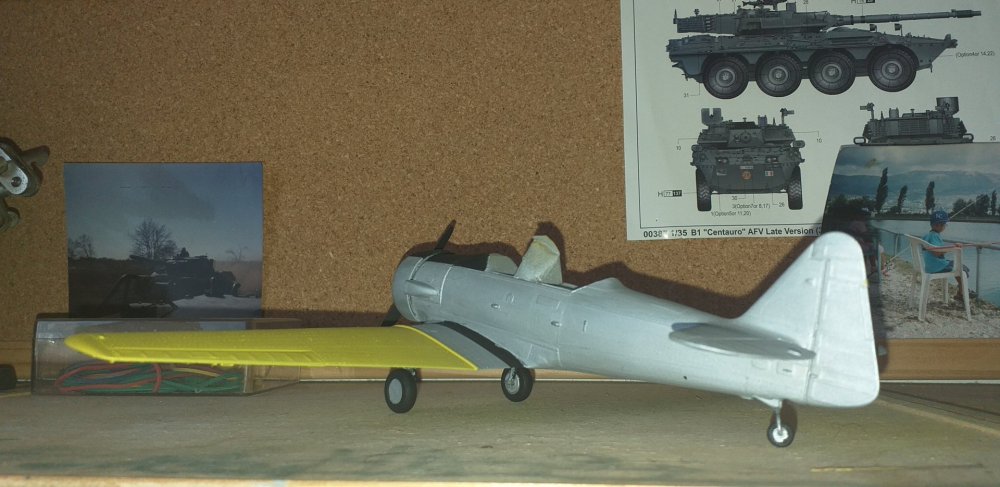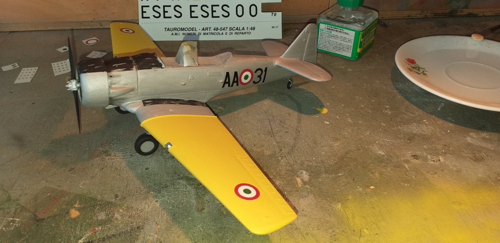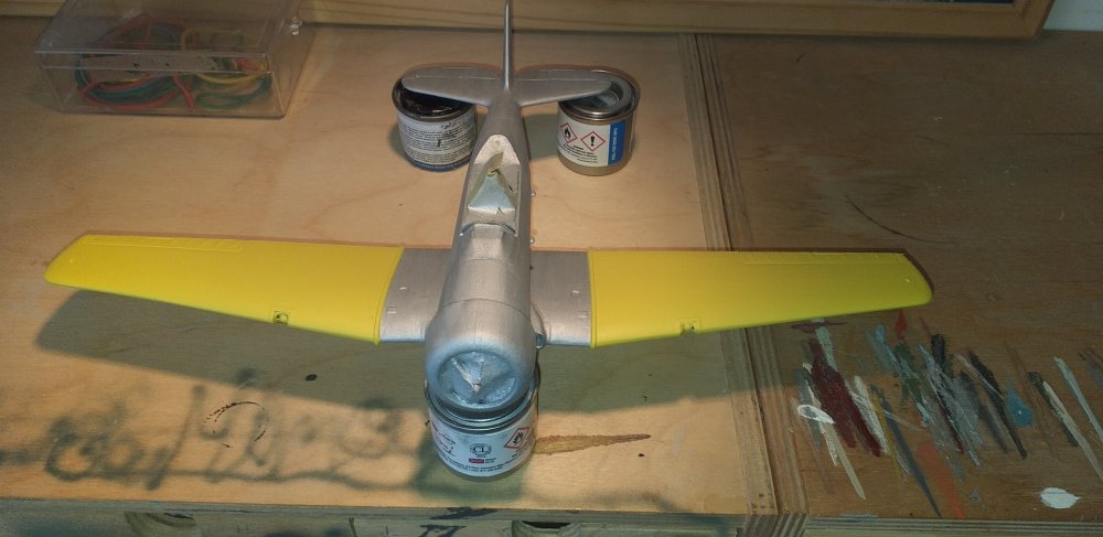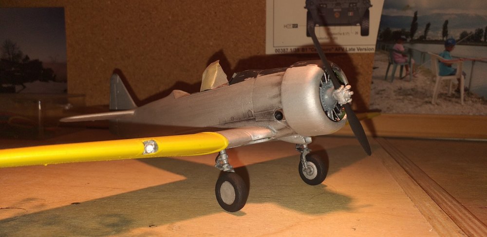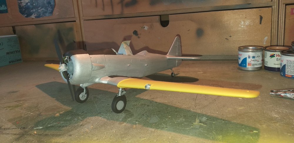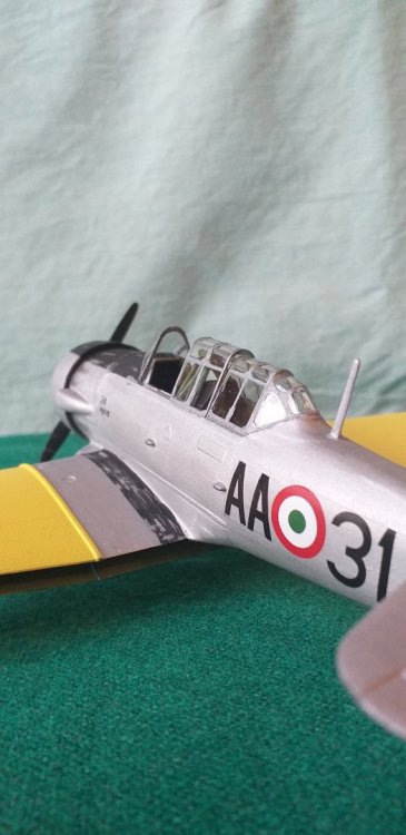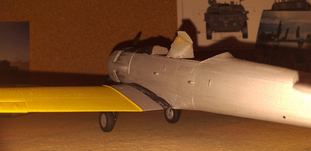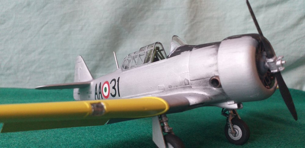 Buongiorno a tutti. Rieccomi qua col Texan che procede (a rilento). Dato l' alluminio ad aerografo, nonostante lo abbia diluito e fatto svariate prove è venuto a buccia d'arancia (per usare un eufemismo). Per cui sverniciatura completa ed applicazione a pennello. Leggera carteggiatura con carta abrasiva 1200 bagnata x eliminare qualche segno di pennellata. L' applicazione del giallo (ad aerografo) sulle ali invece non mi ha creato alcun problema. Non ho ancora ben capito perché ho problemi con i colori alluminio acciaio argento a smalto dati con l'aerografo. Forse per la (ovvia) presenza negli stessi di particelle metalliche nella loro composizione che intasano l' ugello per poi sbloccarlo di colpo e creare parti piu simili a carta vetrata. Bho?! Tant è.