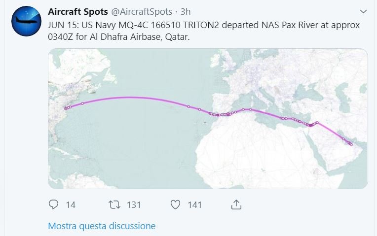 Precisiamo che dovrebbe trattarsi di un RQ-4 Global Hawk Block 10 ceduto alla Navy per fungere da banco prova per MQ-4C Triton.
